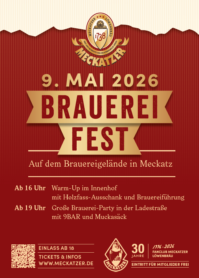 Es ist wieder soweit! Auch in diesem Jahr verwandelt sich für einen Abend das Brauereigelände der Meckatzer Löwenbräu in eine große Partymeile. Am Samstag, 09. Mai 2026 ab 19 Uhr findet die große Meckatzer Brauerei-Party 2026 statt.
